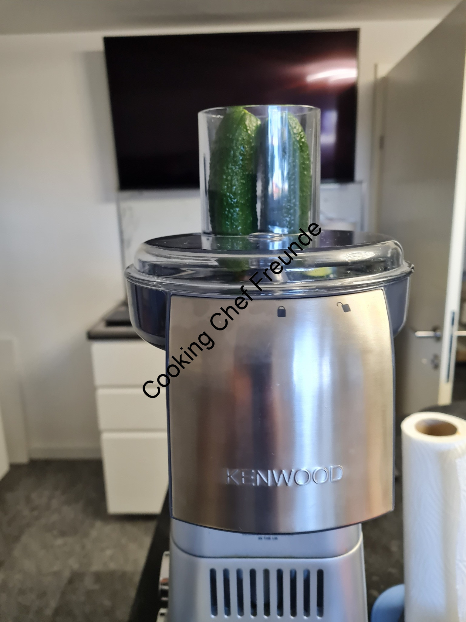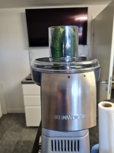 Die Gurke habe ich mit einem Sparschäler zu langen Streifen geschält. Im Nachhinein ist man immer schlauer, ich glaube, das nächste Mal würde ich die grobe Raspel vom Multi einlegen und die Gurke raspeln. Der Multi ist ja schon aufgesetzt und ggf. passt es von der Optik gut zu den Karotten.