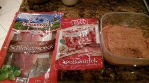 Schinken und Paprikapulver im Multizerkleinerer mit dem Messer pürieren (Anmerkung ca. 3-4 Minuten, mit Spatel ein paar Mal herunterschieben).