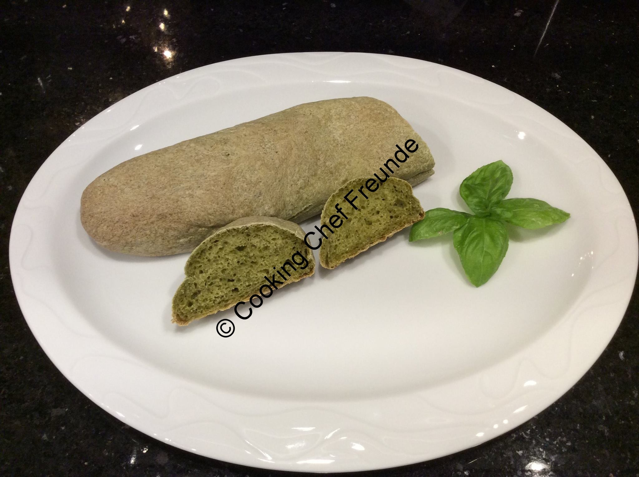 abkühlen lassen und in Baguettescheiben aufschneiden, damit man die tolle grüne Farbe sieht. Sehr lecker und ein Eyecatcher zu verschiedenen Dipps.😀