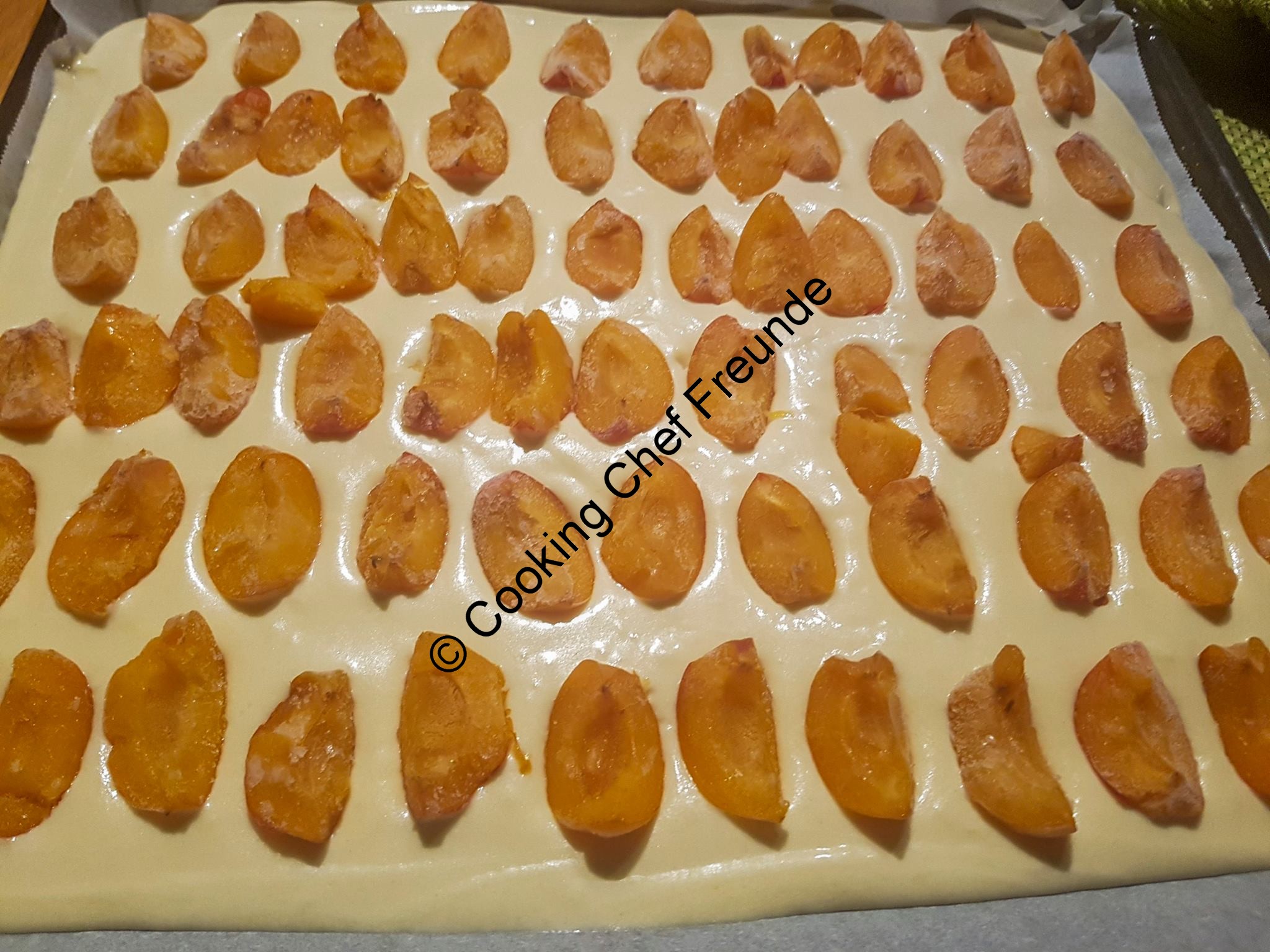 Den Teig auf ein mit Backpapier ausgelegtes Backblech streichen und mit den halbierten Marillen belegen.